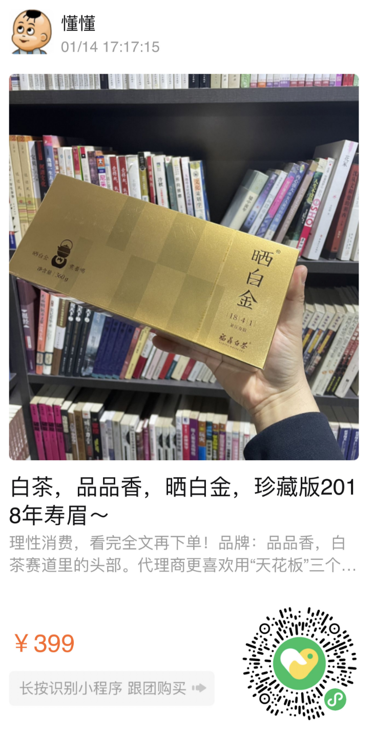 有个赠品,买一盒茶叶送一个学习群的年费会员,我做的最得意的业务就是学习群,一年365天,每天都在群里分享,从未偷懒,基本就是我日常的学习笔记,有视频,有文字,有图片,年费200元。